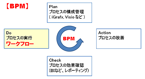 ワークフローは, BPMの 実行 / Do のフェーズを担当するものであり, 計画,計測や改善等の概念はない。つまりは, 決められた流れの通りに 仕事が進めば良いという範囲の概念になる。
